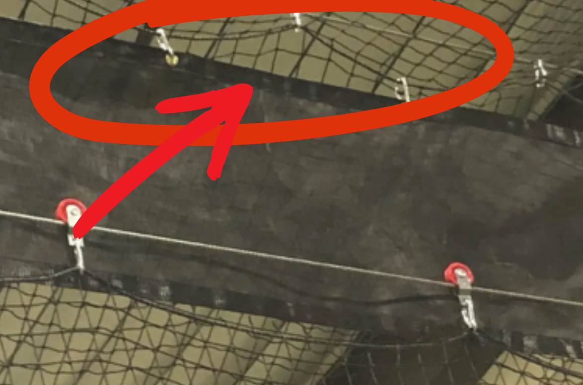 While some installers use spring clips to attach the apron to the ceiling net, we recommend weaving a rope through the grommets and ceiling net. As you can see in the image below, simply using spring clips can create gaps in between allowing balls to fly through, defeating the purpose of the screen.